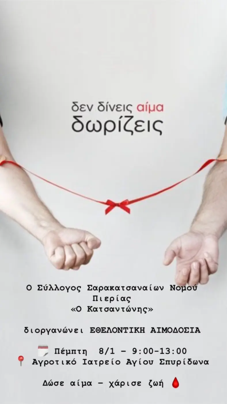 Εθελοντική Αιμοδοσία . Ο Σύλλογος Σαρακατσαναίων Νομού Πιερίας σας προσκαλεί να συμμετάσχετε στην εθελοντική αιμοδοσία που διοργανώνει την: 📅 Πέμπτη 8 Ιανουαρίου 📍 Αγροτικό Ιατρείο Αγίου Σπυρίδωνα ⏰ Ώρες: 09:00 – 13:00 Η προσφορά αίματος είναι πράξη αγάπης και αλληλεγγύης. Με λίγα λεπτά από τον χρόνο μας μπορούμε να χαρίσουμε ζωή σε συνανθρώπους μας που […]
