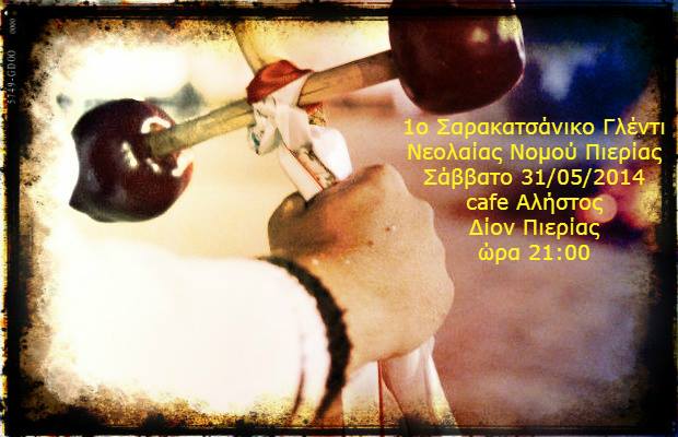 Ο Σύλλογος Σαρακατσαναίων Νομού Πιερίας διοργανώνει και σας προσκαλεί στο 1ο Σαρακατσάνικο Γλέντι Νεολαίας που θα πραγματοποιηθεί το Σάββατο 31/05/2014 στο cafe Αλήστος στο Δίον Πιερίας.