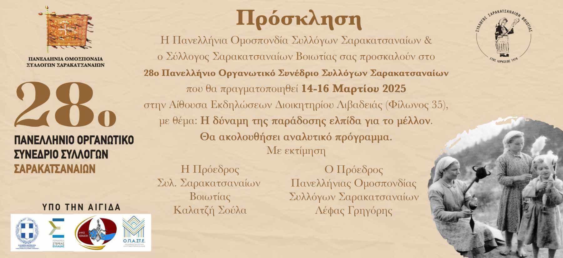 Στις 14-15-16 Μαρτίου 2025 θα πραγματοποιηθεί στη Λιβαδειά της Π.Ε. Βοιωτίας το 28ο Πανελλήνιο Οργανωτικό Συνέδριο Συλλόγων Σαρακατσαναίων. Το συνέδριο τελεί υπό την αιγίδα της Γενικής Γραμματείας Απόδημου Ελληνισμού του Υπουργείου Εξωτερικών και το κεντρικό του μήνυμα συμπυκνώνεται στη φράση «Η δύναμη της παράδοσης ελπίδα για το μέλλον».