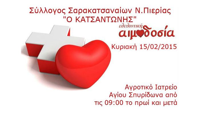 Ο Σύλλογος Σαρακατσαναίων νομού Πιερίας «Ο Κατσαντώνης», διοργανώνει την 3η εθελοντική αιμοδοσία την Κυριακή 15 Φεβρουαρίου 2015 και ώρα 9:00 π.μ. στο Αγροτικό Ιατρείο του Αγίου Σπυρίδωνα Πιερίας.