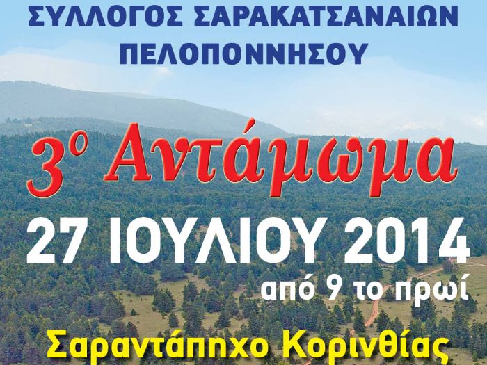 Για τρίτη συνεχόμενη χρονιά οι Σαρακατσαναίοι της Πελοποννήσου διοργανώνουν το δικό τους Αντάμωμα στο Σαραντάπηχο Κορινθίας και καλούν όλους τους Σαρακατσάνους της Ελλάδας να παρευρεθούν την  Κυριακή 27 Ιουλίου 2014 και ώρα 09:00 πμ στα βουνά της ορεινής Κορινθίας για να αναβιώσουν με τον δικό τους μοναδικό τρόπο την Σαρακατσάνικη παράδοση.