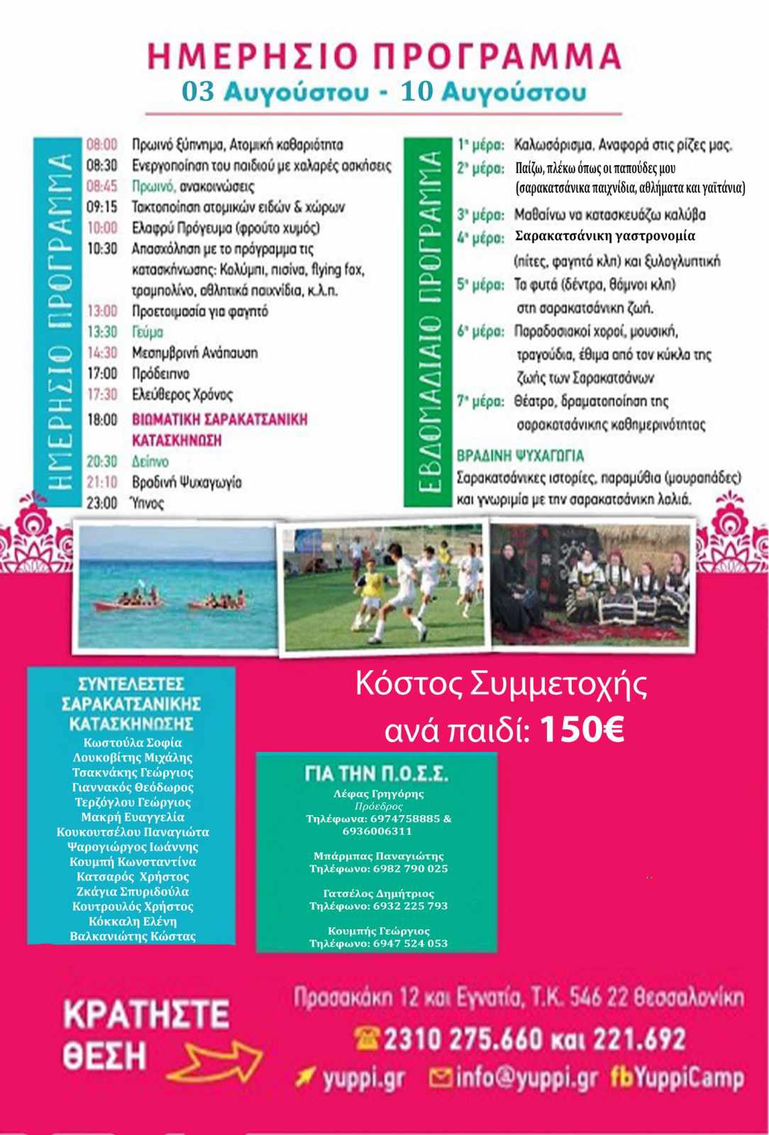 Για περισσότερες πληροφορίες απευθύνεστε στις κατασκηνώσεις YUPPI στα τηλέφωνα 2310275660 και 2310221692 και στα τηλέφωνα των μελών της Π.Ο.Σ.Σ