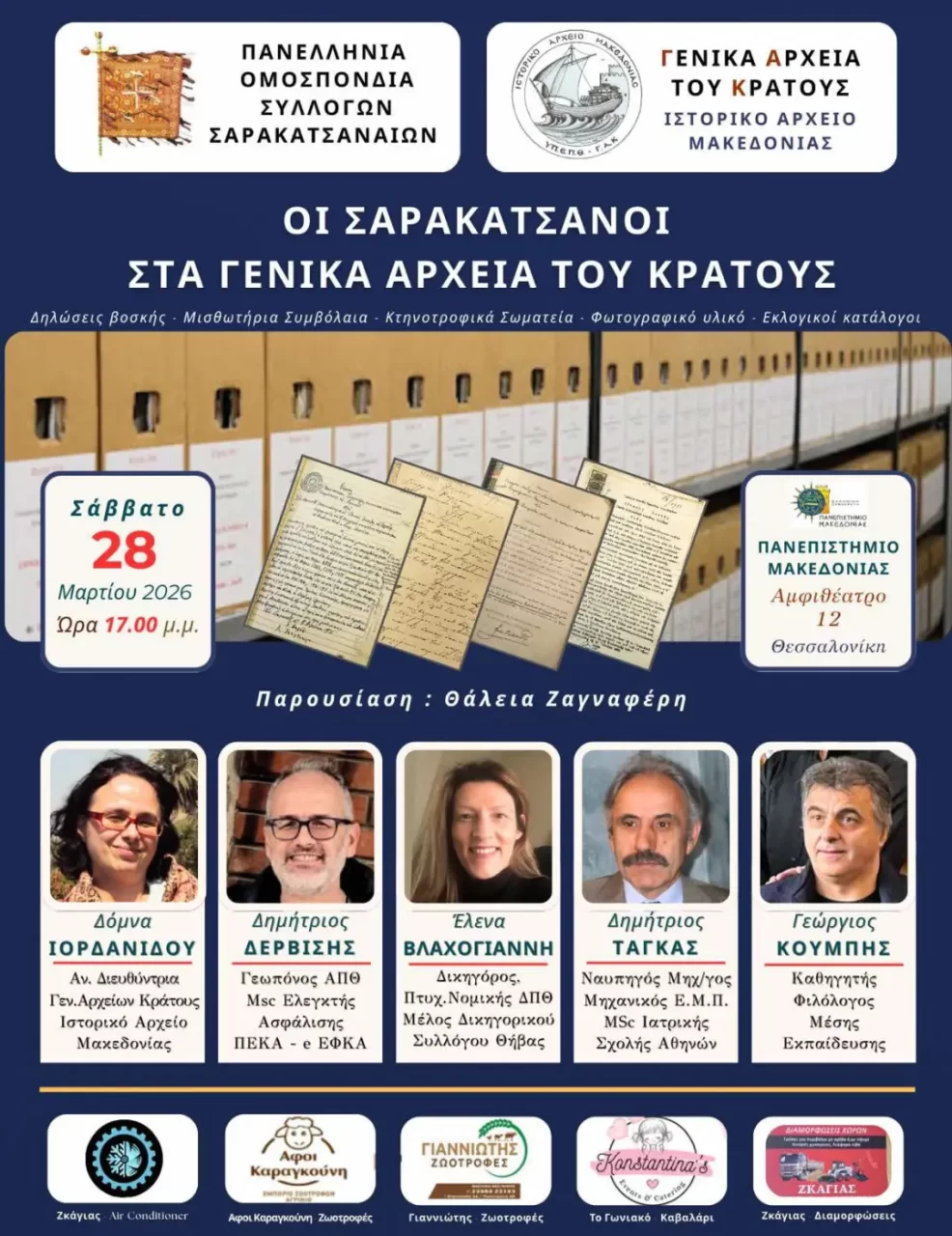 Η Πανελλήνια Ομοσπονδία Συλλόγων Σαρακατσαναίων (Π.Ο.Σ.Σ.) σας προσκαλεί στην ημερίδα που διοργανώνει το Σάββατο 28 Μαρτίου 2026 και ώρα 17:00, στην αίθουσα συνεδρίων «Ηλίας Κουσκουβέλης» (Αμφιθέατρο 12) του Πανεπιστημίου Μακεδονίας.