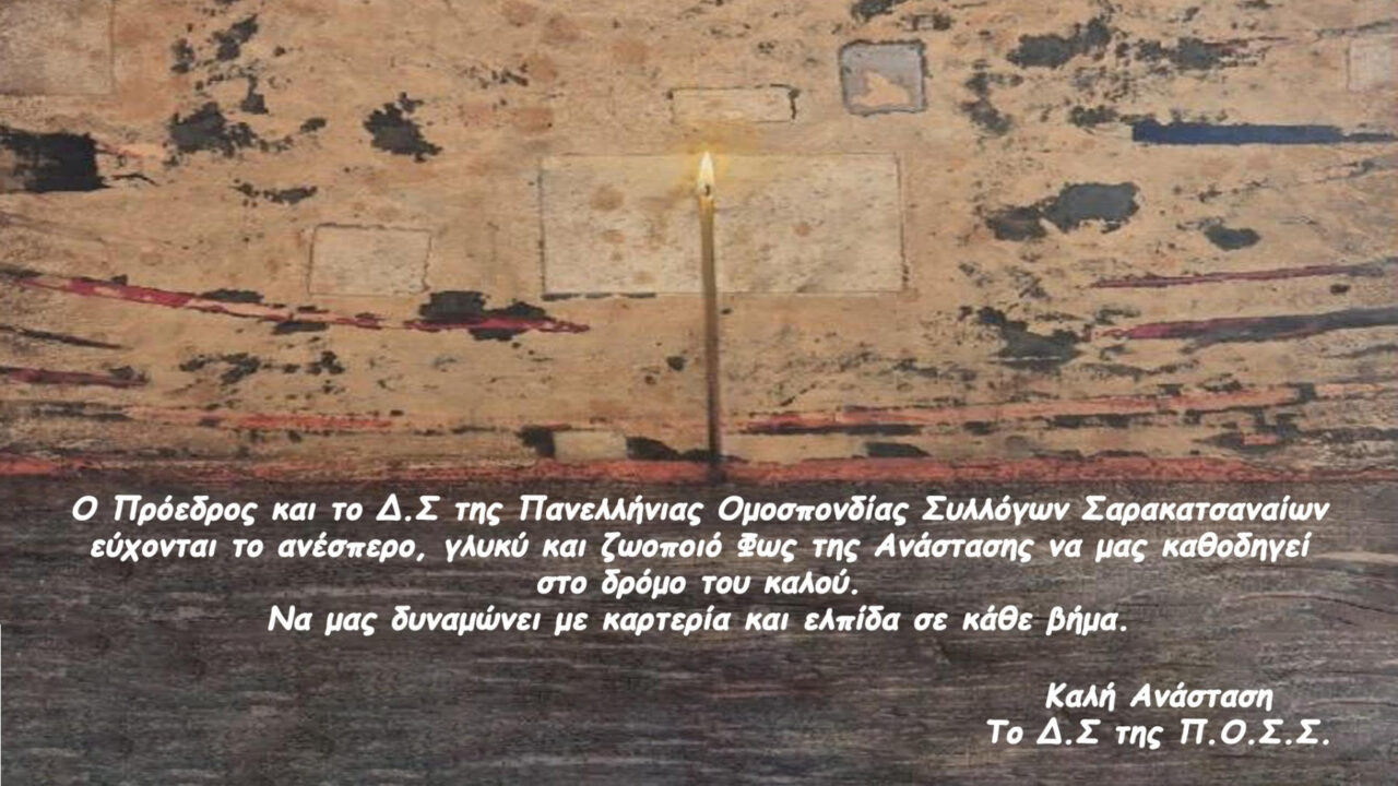 Ο Πρόεδρος και το Δ.Σ της Πανελλήνιας Ομοσπονδίας Συλλόγων Σαρακατσαναίων εύχονται το ανέσπερο, γλυκύ και ζωοποιώ Φως της Ανάστασης να μας καθοδηγεί στο δρόμο του καλού.