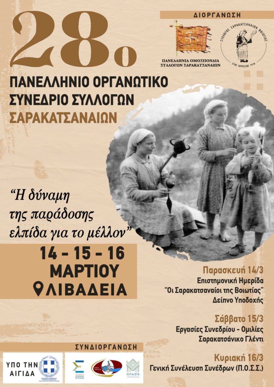 Στον απόηχο του 28ου Πανελληνίου Οργανωτικού Συνεδρίου Συλλόγων Σαρακατσαναίων με σύνθημα η δύναμη της παράδοσης ελπίδα για το μέλλον, που πραγματοποιήθηκε στην πόλη της Λιβαδειάς 14-16 Μαρτίου 2025, o Σύλλογος Σαρακατσαναίων Βοιωτίας σε συνεργασία με την Π.Ο.Σ.Σ., εισπράττουμε ότι οι προσπάθειες μας απέδωσαν και ότι το Συνέδριο στέφθηκε με απόλυτη επιτυχία.