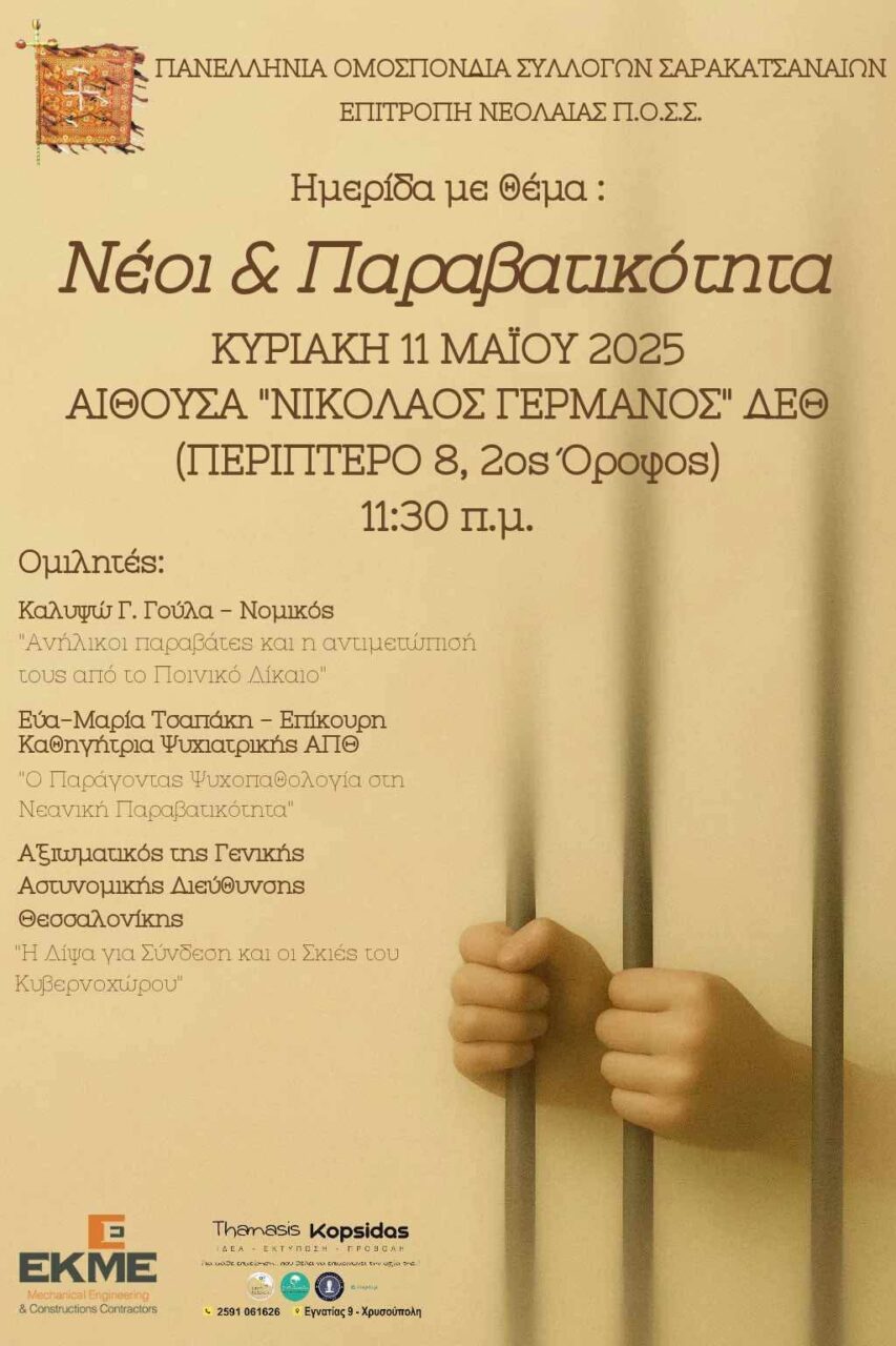 Η Επιτροπή Νεολαίας της Π.Ο.Σ.Σ., με την υποστήριξη της Πανελλήνιας Ομοσπονδίας Συλλόγων Σαρακατσαναίων, διοργανώνει ημερίδα για την κατανόηση και πρόληψη της νεανικής παραβατικότητας.