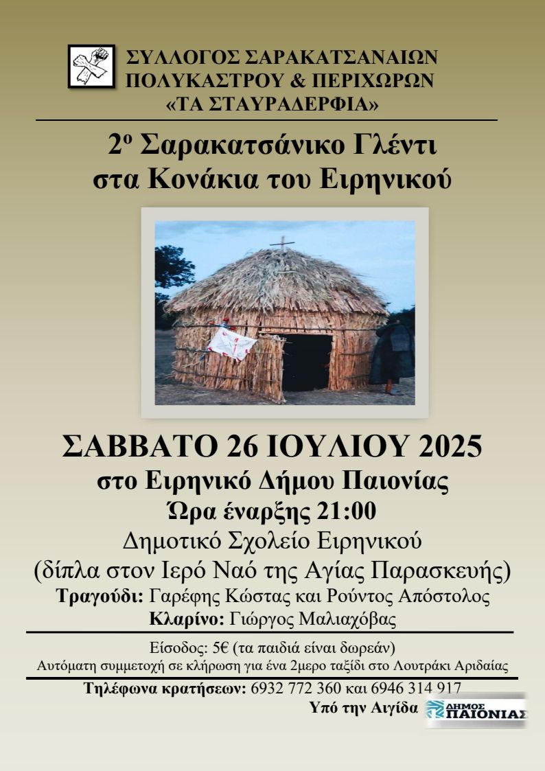 Ο Σύλλογος Σαρακατσαναίων Πολυκάστρου και Περιχώρων «ΤΑ ΣΤΑΥΡΑΔΕΡΦΙΑ» σας προσκαλεί να τιμήσετε με την παρουσία σας το «2ο Σαρακατσάνικο Γλέντι στα Κονάκια του Ειρηνικού» το Σάββατο 26 Ιουλίου 2025