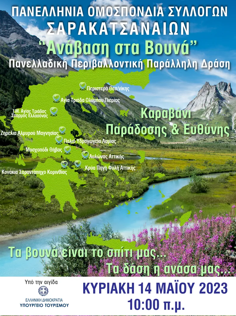 Η Πανελλήνια Ομοσπονδία Συλλόγων Σαρακατσαναίων (Π.Ο.Σ.Σ.) υπό την αιγίδα του Υπουργείου Τουρισμού, διοργανώνει Πανελλαδικά μαζί με τους κατά τόπους συλλόγους, – πιλοτικά για πρώτη φορά – συμβολική ανάβαση στα βουνά ΤΗΝ ΚΥΡΙΑΚΗ 14 ΜΑΙΟΥ 2023 και ώρα 10.00 το πρωί σε διαφορετικές γεωγραφικές περιοχές ταυτόχρονα.