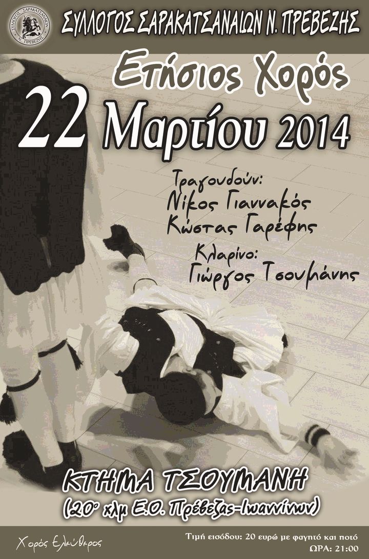 Το Διοικητικό Συμβούλιο του Συλλόγου Σαρακατσαναίων Νομού Πρεβέζης σας προσκαλεί στον ετήσιο χορό , που διοργανώνει το Σάββατο 22 Μαρτίου και ώρα 21.00 στην αίθουσα εκδηλώσεων “Κτήμα Τσουμάνη” (20ο χλμ Ε.Ο. Πρέβεζας – Ιωαννίνων).