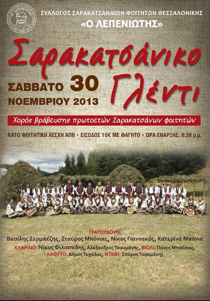 Ο Σύλλογος Σαρακατσαναίων Φοιτητών Θεσσαλονίκης “o Λεπενιώτης” σας προσκαλεί στον καθιερωμένο χορό βράβευσης πρωτοετών φοιτητών που διοργανώνει το Σάββατο 30 Νοεμβρίου και ώρα 20:30 στην Κάτω Φοιτητική Λέσχη του Α.Π.Θ.