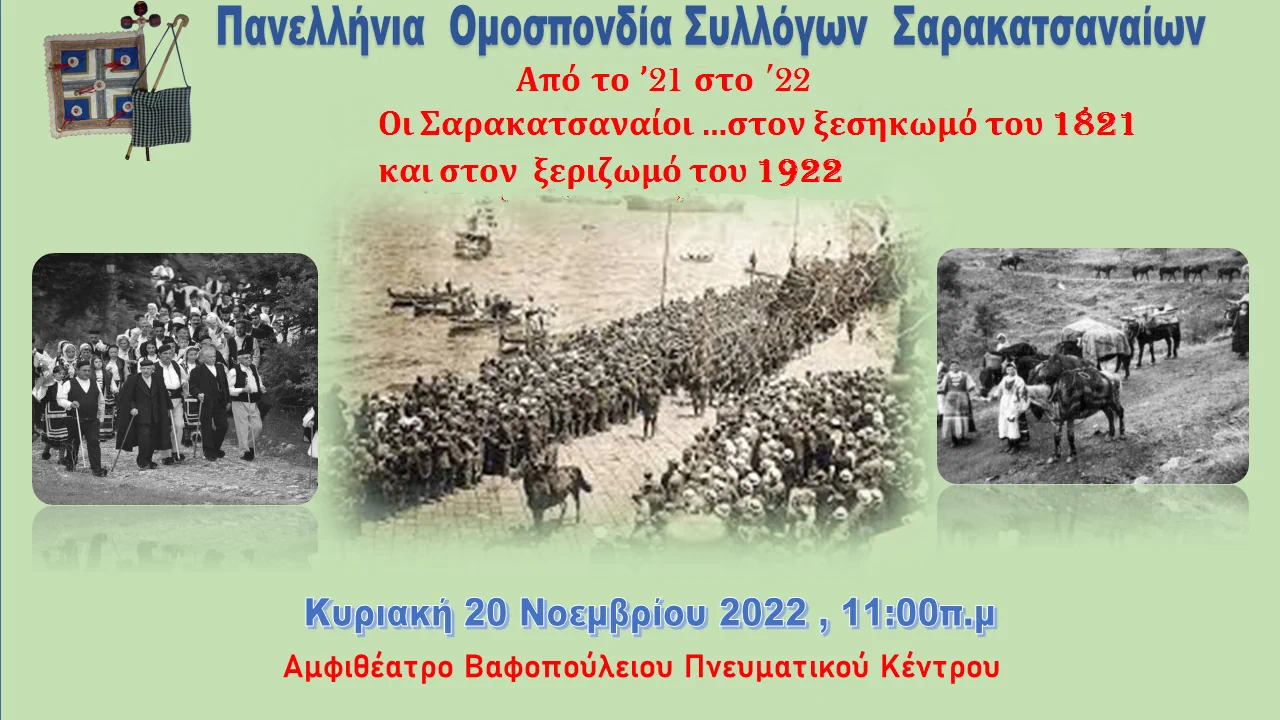 Σε σεβασμό προς την Εθνική Επέτειο της συμπλήρωσης των 100 χρόνων από την Μικρασιατική Καταστροφή και με στόχο να αποδώσουν την δέουσα τιμή προς όλους εκείνους που έγραψαν με το αίμα τους, την πιο αιματοβαμμένη σελίδα της νεοελληνικής ιστορία μας, η Πανελλήνια Ομοσπονδία Συλλόγων Σαρακατσαναίων, πραγματοποιεί Ημερίδα με θέμα «Από το ΄21 στο ΄22. Οι Σαρακατσαναίοι στον ξεσηκωμό του 1821 και στον ξεριζωμό του 1922» την Κυριακή 20 Νοεμβρίου στις 11.00 πμ στο Βαφοπούλειο Πνευματικό Κέντρο του Δήμου Θεσσαλονίκης, με την αιγίδα του Υπουργείου Εσωτερικών Τομέας Μακεδονίας Θράκης, και της Περιφέρειας Κεντρικής Μακεδονίας.