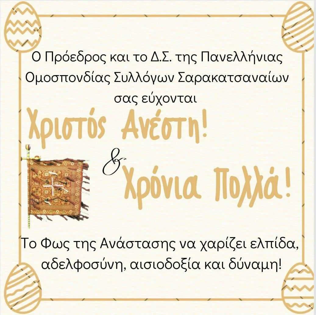 Ο Πρόεδρος και το Δ.Σ. της Πανελλήνιας Ομοσπονδίας Συλλόγων Σαρακατσαναίων σας εύχονται Χριστός Ανέστη & Χρόνια Πολλά! Το Φως της Ανάστασης να χαρίζει ελπίδα, αδελφοσύνη, αισιοδοξία και δύναμη!