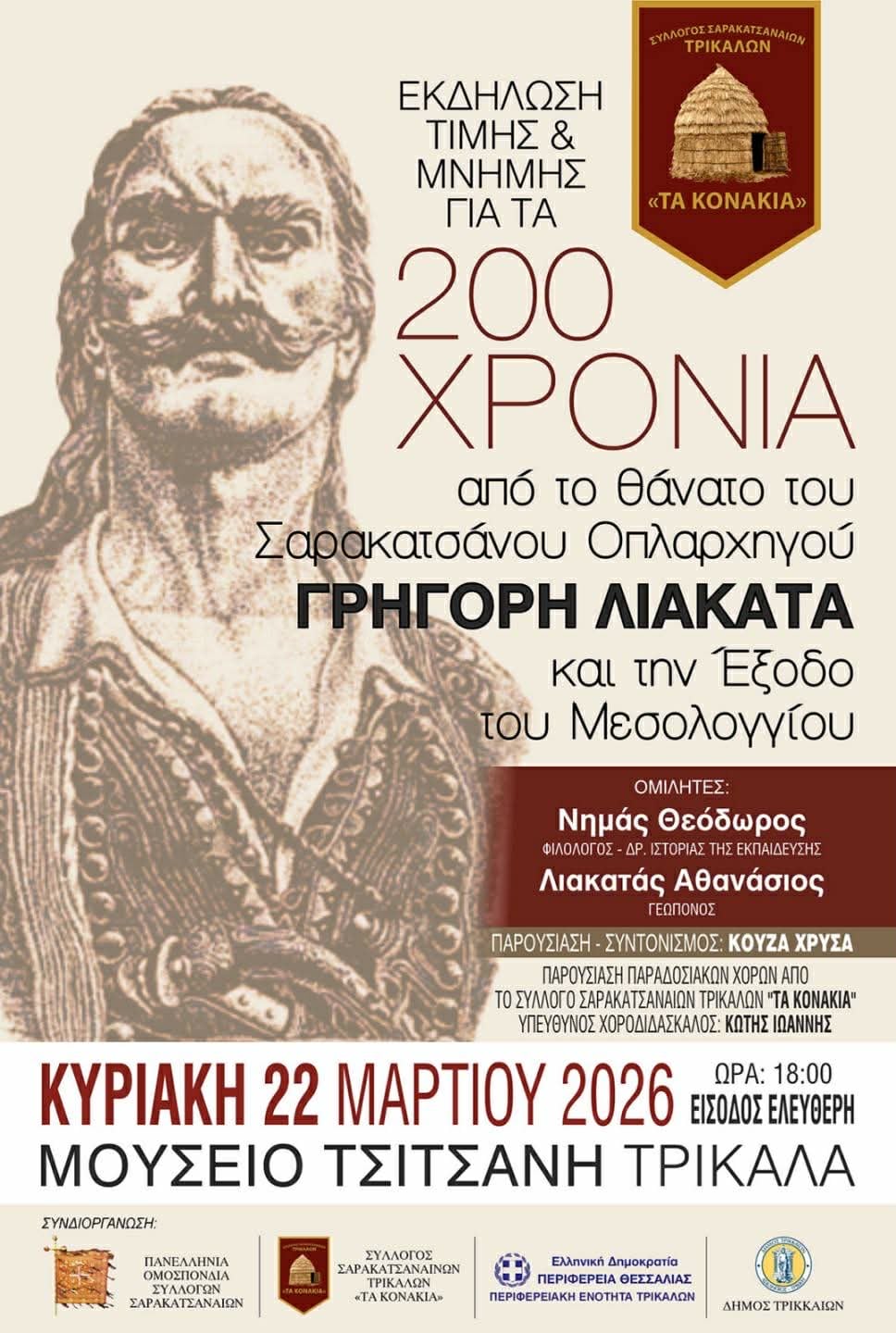 ΕΚΔΗΛΩΣΗ ΤΙΜΗΣ & ΜΝΗΜΗΣ για τα 200 χρόνια από τον ηρωικό θάνατο του Σαρακατσάνου Οπλαρχηγού Γρηγόρη Λιακατά