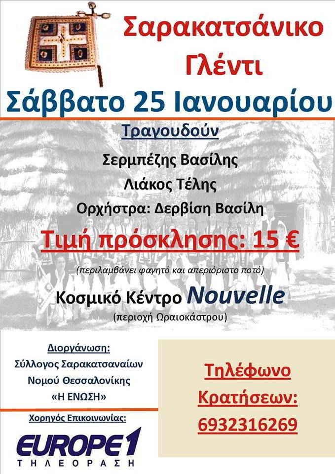 Σας περιμένουμε 25 Ιανουαρίου στο γλέντι του Συλλόγου Σαρακατσαναίων Νομού Θεσσαλονίκης “Η ΕΝΩΣΗ” στο κοσμικό κέντρο NOUVELLE,περιοχή Ωραιοκάστρου.