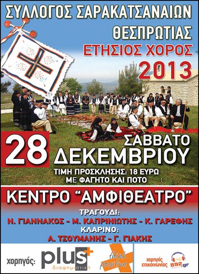 Ο σύλλογος Σαρακατσαναίων Θεσπρωτίας σας ενημερώνει ότι φέτος ο ετήσιος χορός θα γίνει, το Σάββατο στις 28 Δεκεμβρίου 2013, στο κέντρο ”ΑΜΦΙΘΕΑΤΡΟ” στην Αγία Μαρίνα Ηγουμενίτσας!