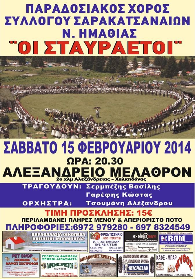 Ο Σύλλογος Σαρακατσαναίων Ν. Ημαθίας «Οι Σταυραετοί» σας προσκαλεί στον ετήσιο χορό του, το Σάββατο 15 Φεβρουαρίου 2014 στο κέντρο «Αλεξάνδρειο Μέλαθρον» (2ο χλμ. Αλεξάνδρειας – Χαλκηδόνας). Ώρα έναρξης 20:30. Στο τραγούδι είναι ο Βασίλης Σερμπέζης και ο Κώστας Γαρέφης με την ορχήστρα του Αλέξανδρου Τσουμάνη. Τιμή εισόδου 15 € με πλήρες μενού και απεριόριστο ποτό.