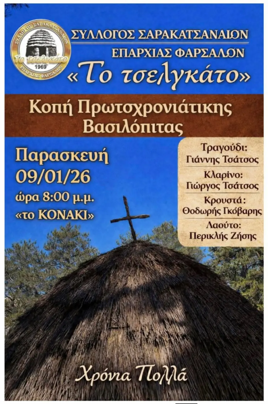 Σας περιμένουμε την Παρασκευή 9 Ιανουαρίου και ώρα 8.00 μ.μ., στην ταβέρνα «το Κονάκι» στα Φάρσαλα , για την κοπή της πρωτοχρονιάτικης πίτας την οποία θα συνοδεύει το πρώτο γλέντι για την νέα χρονιά.