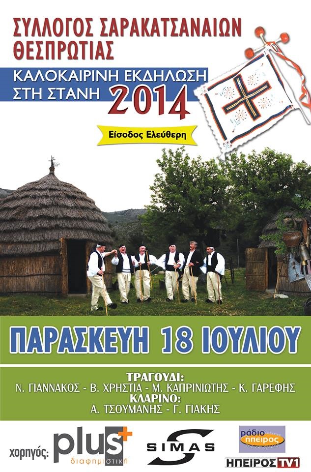 Ο σύλλογος Σαρακατσαναίων Θεσπρωτίας όπως κάθε χρόνο έτσι και φέτος διοργανώνει την Παρασκευή 18 Ιουλίου 2014 το καλοκαιρινό αντάμωμα Σαρακατσαναίων, στο Τσιμπουρικι στην Ηγουμενίτσα, στην σαρακατσάνικη στάνη.