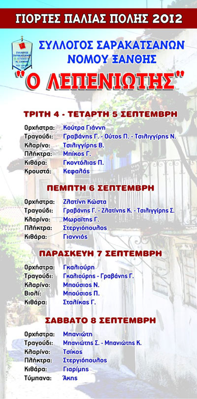 Όπως κάθε χρόνο, έτσι και φέτος, πραγματοποιήθηκαν με επιτυχία οι Γιορτές Παλαιάς Πόλης στην Ξάνθη, από το Κέντρο Πολιτισμού του Δήμου Ξάνθης. Ο εν λόγω θεσμός συμπλήρωσε φέτος τα 22 χρόνια διοργάνωσής του και κατά τη διάρκεια του (29/08/2012 – 09/09/2012) συμμετείχε και ο δραστήριος Σύλλογος Σαρακατσαναίων Ξάνθης “Ο Λεπενιώτης”. Συγκεκριμένα ο σύλλογος Σαρακατσαναίων του Νομού συμμετείχε στις εκδηλώσεις του Δήμου διοργανώνοντας Σαρακατσάνικες βραδυές (στις 4,5,6,7 & 8/09/2012) με παραδοσιακή σαρακατσάνικη μουσική, σε χώρο που του παραχωρήθηκε από το δήμο.