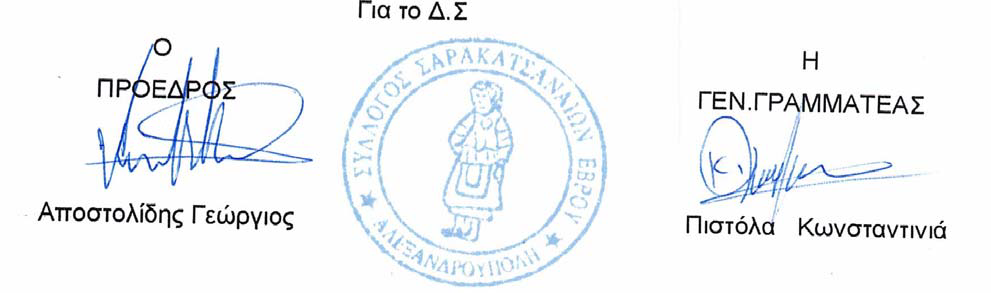 Ο Σύλλογος Σαρακατσαναίων Ν. Έβρου ανακοινώνει ότι από τη Γ.Σ των μελών, που πραγματοποιήθηκε την Κυριακή 13 Οκτ. 2024 , προέκυψε νέο Διοικητικό Συμβούλιο, το οποίο αφού συνήλθε τη Δευτέρα 14 Οκτ. συγκροτήθηκε σε Σώμα, όπως παρακάτω: