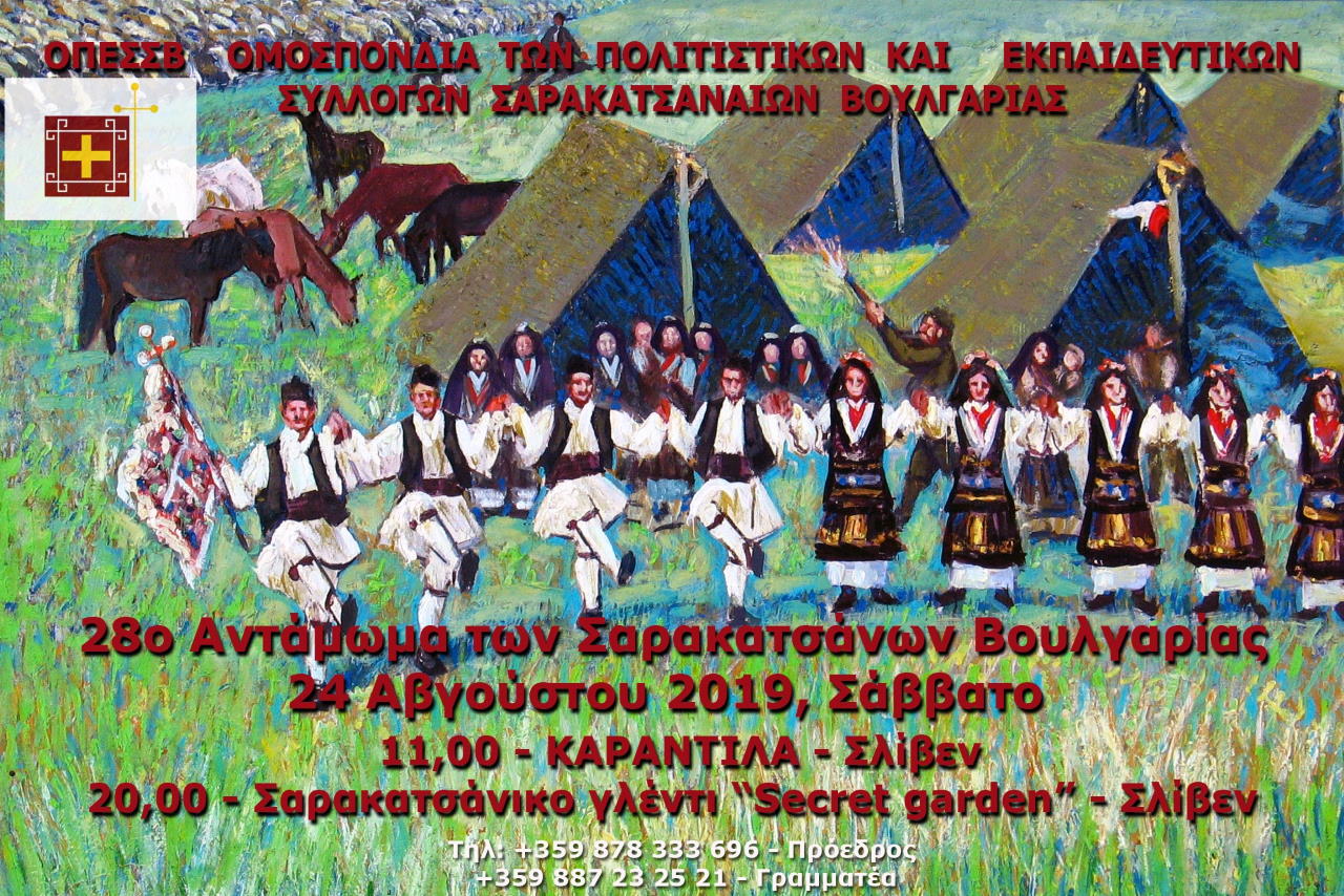 Ο Πρόεδρος και το Δ.Σ. της Ομοσπονδίας των Πολιτιστικών και Εκπαιδευτικών Συλλόγων Σαρακατσαναίων Βουλγαρίας (Ο.Π.Ε.Σ.Σ.Β) σας προσκαλούν στο 28ο καλοκαιρινό αντάμωμα που διοργανώνουν το Σάββατο 24 Αυγούστου 2019 και ώρα 11:00 στο Σλίβεν στη θέση Καραντίλα.