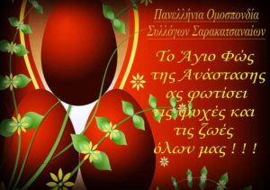 Ο Πρόεδρος και τo Δ.Σ. της Πανελλήνιας Ομοσπονδίας Συλλόγων Σαρακατσαναίων εύχεται σε όλο τον κόσμο Καλό Πάσχα και Καλή Ανάσταση! Το Άγιο Φως της Αναστάσεως ας φωτίσει τις ψυχές και