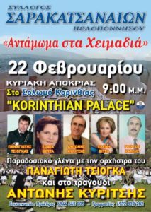 Ο Σύλλογος Σαρακατσαναίων Πελοποννήσου πραγματοποιεί «Αντάμωμα στα Χειμαδιά» και τον ετήσιο χορό του την Κυριακή της Αποκριάς 22 Φεβρουαρίου από τις 9 το βράδυ στο κέντρο Korinthian Palace στο Σολωμό Κορινθίας. Σας προσκαλούμε