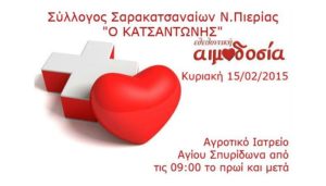 Ο Σύλλογος Σαρακατσαναίων νομού Πιερίας «Ο Κατσαντώνης», διοργανώνει την 3η εθελοντική αιμοδοσία την Κυριακή 15 Φεβρουαρίου 2015 και ώρα 9:00 π.μ. στο Αγροτικό Ιατρείο του Αγίου Σπυρίδωνα Πιερίας. Η αιμοδοσία