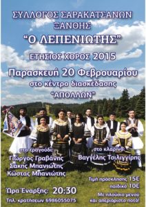 Ο σύλλογος Σαρακατσαναίων νομού Ημαθίας, σας προσκαλεί στον ετήσιο παραδοσιακό χορό του που γίνει το Σάββατο 7 Φεβρουάριου 2015 και ώρα 20.30 στο κέντρο «Αλεξάνδρειο Μέλαθρον» που βρίσκετε στο 2ο χλμ