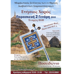 ΠΡΟΣΚΛΗΣΗ Το ΔΣ του Μορφωτικού Συλλόγου των εν Θράκη Διαβιούντων Σαρακατσαναίων σας προσκαλεί στον ετήσιο χορό του, την Παρασκευή 02 Γεναριού 2015 στο κέντρο «Ποσειδώνιο» στο 7ο χμ Κομοτηνής- Π.
