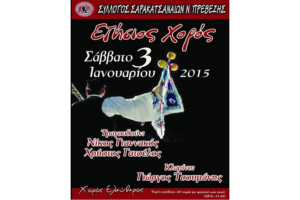 Ο Σύλλογος Σαρακατσαναίων Ν. Πρεβέζης σας εύχεται χρόνια πολλά και σας προσκαλεί στον ετήσιοχορό του το Σαββάτο 3 Ιανουαρίου 2015 και ώρα 21.00 στην αίθουσα εκδηλώσεων «Κτήμα Τσουμάνη» (20ο χλμ