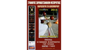 Ο σύλλογος Σαρακατσαναίων Θεσπρωτίας σας ενημερώνει ότι φέτος ο ετήσιος χορός του συλλόγου θα πραγματοποιηθεί την Παρασκευή 26 Δεκεμβρίου 2014 στο αμφιθέατρο Ηγουμενίτσας. Στο τραγούδι : ΝΙΚΟΣ ΓΙΑΝΝΑΚΟΣ ΜΙΧΑΛΗΣ ΚΑΠΡΙΝΙΩΤΗΣ