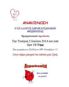 Ο Σύλλογος Σαρακατσαναίων Θεσπρωτίας πραγματοποιεί εθελοντική αιμοδοσία την Τετάρτη 2 Ιουλίου 2014 και ώρα 18:00 μ.μ. στα γραφεία του Συλλόγου ,28ης Οκτωβρίου 11 (1ος όροφος), Ηγουμενίτσα. Παρακαλούμε τα μέλη μας
