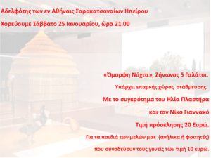 Η Αδελφότητα των εν Αθήναις Σαρακατσαναίων Ηπείρου,θα πραγματοποιήσει τον ετήσιο χορό της την 25 ΙΑΝ 2014 ,στο κέντρο ΟΜΟΡΦΗ ΝΥΚΤΑ στην οδό ΖΗΝΩΝΟΣ αριθμός 5 στο Γαλάτσι. Τιμή πρόσκλησης 20 ευρώ