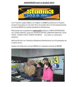 Το Studio3 ως χορηγός επικοινωνίας της Πανελλήνιας Ομοσπονδίας Συλλόγων Σαρακατσαναίων, στην προσπάθεια του να αναδείξει το έργο και τις προσπάθειες που κάνει η Πανελλήνια Ομοσπονδία και με αφορμή το 23ο Οργανωτικό