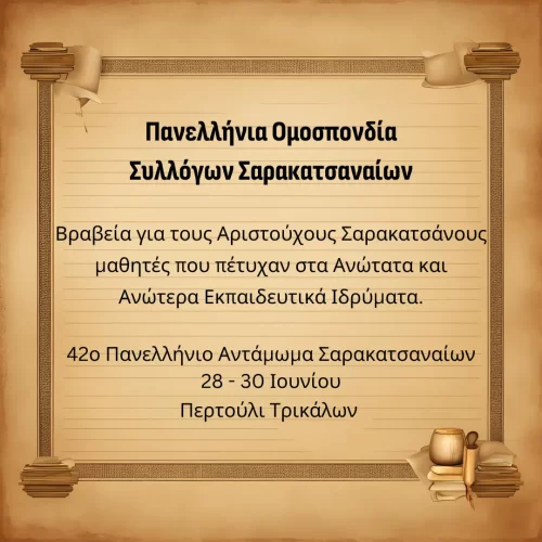 Όπως έχει καθιερωθεί κάθε χρόνο, η Πανελλήνια Ομοσπονδία Συλλόγων Σαρακατσαναίων θα βραβεύσει τους έξι πρώτους νέους, Σαρακατσάνους στην καταγωγή, που έχουν πρωτεύσει κατά την εισαγωγή τους το 2023 στα Ανώτατα και Ανώτερα Εκπαιδευτικά Ιδρύματα.