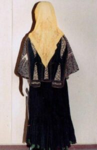 - Μαντήλι. Το μαντήλι ήταν μαύρο με κρόσσια γύρω. Στη μία άκρη του είχε σχέδιο σταμπωτό. Το μαντήλι το φορούσαν, σύμφωνα πάντα με στοιχεία από παλιές φωτογραφίες, δεμένο στα μαλλιά, αφήνοντας ελεύθερο το πρόσωπο και το λαιμό, όπως αρμόζει στη Σαρακατσάνα η οποία ζούσε ελεύθερη.