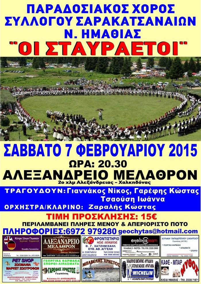 Ο σύλλογος Σαρακατσαναίων νομού Ημαθίας, σας προσκαλεί στον ετήσιο παραδοσιακό χορό του που γίνει το Σάββατο 7 Φεβρουάριου 2015 και ώρα 20.30 στο κέντρο «Αλεξάνδρειο Μέλαθρον» που βρίσκετε στο 2ο χλμ Αλεξάνδρειας – Χαλκηδόνας.