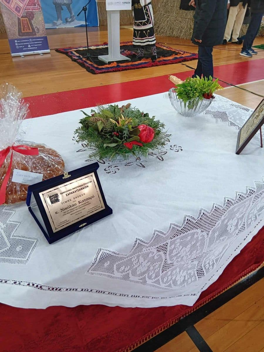 Οφειλόμενο χρέος που όμως περιποιεί τιμή σ’ όλους τους Σαρακατσάνους υπήρξε η βράβευση του πρώην Αντιπροέδρου της Βουλής κ. Κατσαρού Νικολάου για την αταλάντευτη στήριξη και προβολή του σιναφιού σε όλα τα χρόνια της αξιοζήλευτης δράσης του.