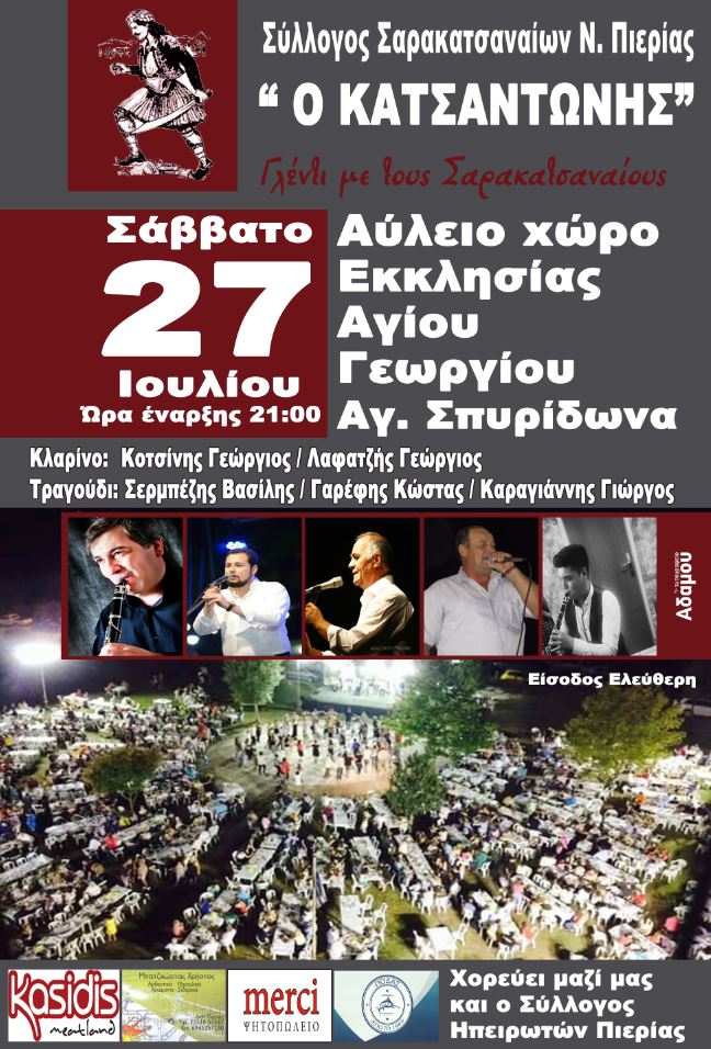 Ο Πρόεδρος και το Δ.Σ. του Συλλόγου Σαρακατσαναίων Ν. Πιερίας ‘’Ο ΚΑΤΣΑΝΤΩΝΗΣ’’ σας προσκαλούν στο καλοκαιρινό γλέντι που διοργανώνουν το Σάββατο 27Ιουλίου 2019 και ώρα 20:30 στον αύλειο χώρο του Ιερού Ναού του Αγίου Γεωργίου στον Άγιο Σπυρίδωνα Πιερίας.