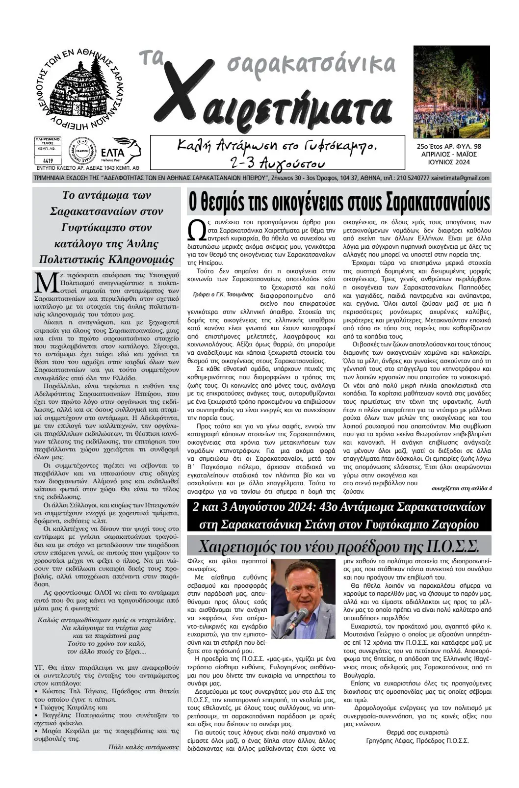 Τα Σαρακατσάνικα Χαιρετήματα της Αδελφότητας των εν Αθήναις Σαρακατσαναίων Ηπείρου – Φύλλο 98