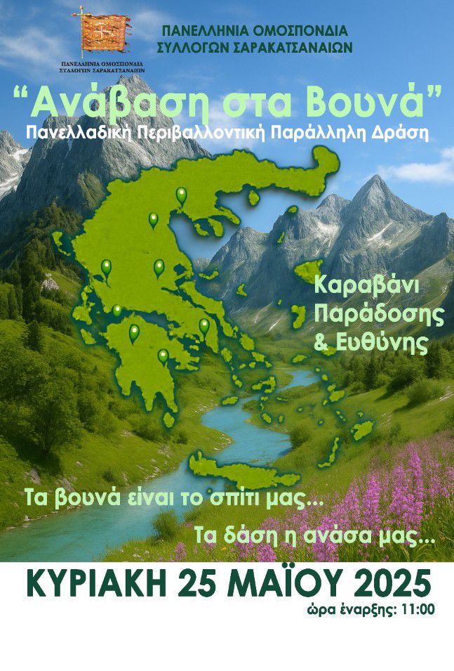 Η Πανελλήνια Ομοσπονδία Συλλόγων Σαρακατσαναίων διοργανώνει την 3η Ανάβαση στα Βουνά, την Κυριακή 25 Μαΐου 2025, με στόχο την προστασία του περιβάλλοντος και την ανάδειξη της άρρηκτης σχέσης των Σαρακατσαναίων με τη φύση και τα δάση. Συμμετέχουν σύλλογοι από όλη την Ελλάδα, σε μια δράση που καθιερώνεται ως θεσμός.