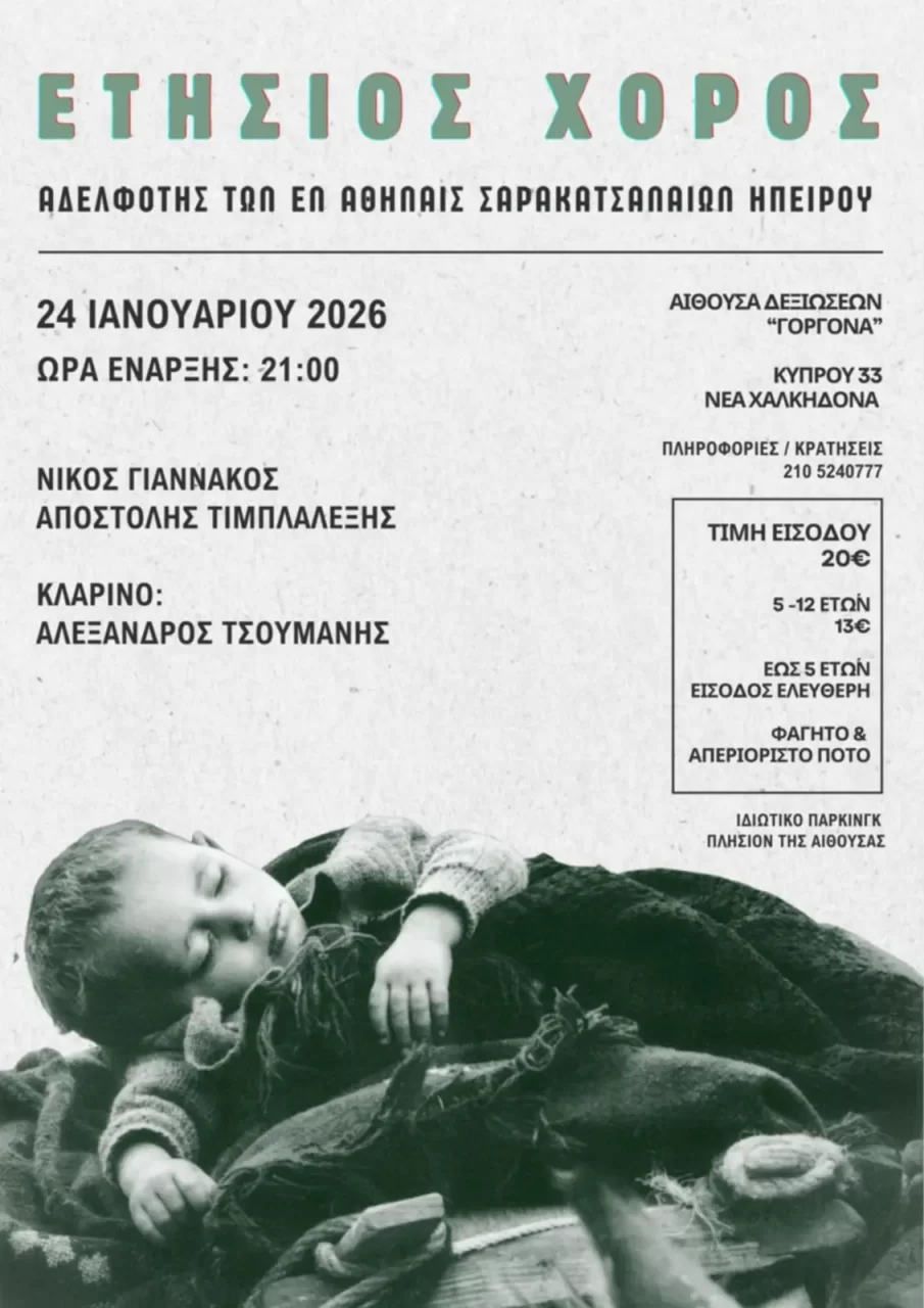 Με μεγάλη χαρά σας προσκαλούμε στον ετήσιο χορό της Αδελφότητάς, το Σάββατο 24/01/2026 στο κέντρο δεξιώσεων «Γοργόνα» (Νέα Χαλκηδόνα Αττικής), όπου όλοι μαζί θα γλεντήσουμε με παραδοσιακά σαρακατσάνικα τραγούδια μέχρι […]
