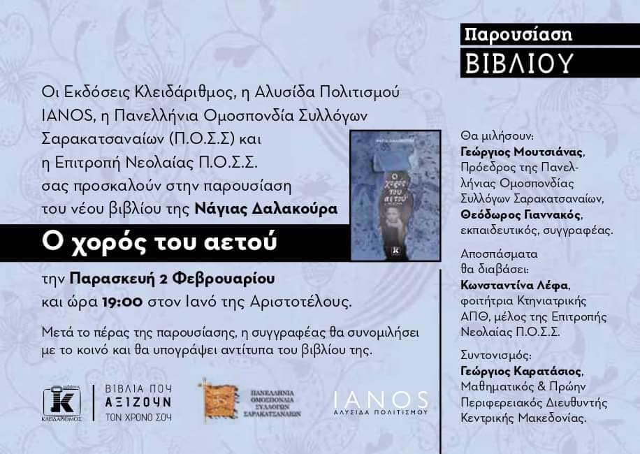 Η Πανελλήνια Ομοσπονδία Συλλόγων Σαρακατσαναίων (Π.Ο.Σ.Σ.), η Επιτροπή νεολαίας της Π.Ο.Σ.Σ και οι εκδόσεις Κλειδάριθμος, παρουσίασαν το βιβλίο της κ. Νάγιας Δαλακούρα «Ο χορός του αετού», στον φιλόξενο χώρο της αλυσίδας πολιτισμού Ιανός στη Θεσσαλονίκη τη Παρασκευή 2 Φεβρουαρίου 2024.