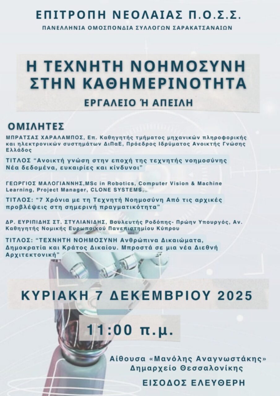 Η Επιτροπή νεολαίας της Π.Ο.Σ.Σ. διοργανώνει επιστημονική ημερίδα “Η τεχνητή νοημοσύνη στην καθημερινότητα. Εργαλείο ή Απειλή”