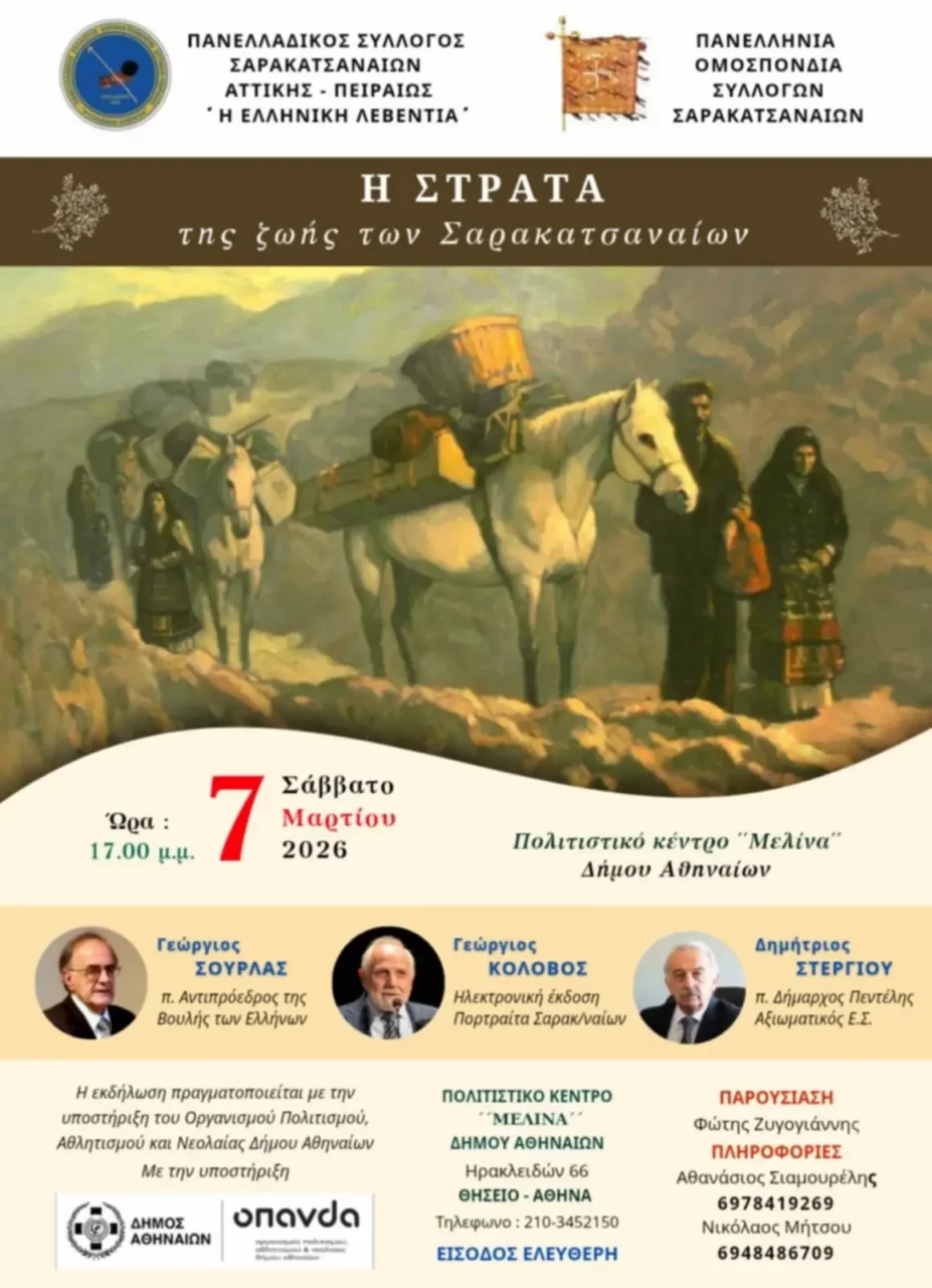 Η Πανελλήνια Ομοσπονδία Συλλόγων Σαρακατσαναίων, σε συνεργασία με τον Πανελλαδικό Σύλλογο Σαρακατσαναίων Αττικής-Πειραιώς «Η Ελληνική Λεβεντιά», διοργάνωσε το Σάββατο 7 Μαρτίου 2026, στο Πολιτιστικό Κέντρο «Μελίνα» του Δήμου Αθηναίων, την εκδήλωση «Η Στράτα της Ζωής των Σαρακατσαναίων», η οποία σημείωσε μεγάλη επιτυχία και θερμή ανταπόκριση από το κοινό.