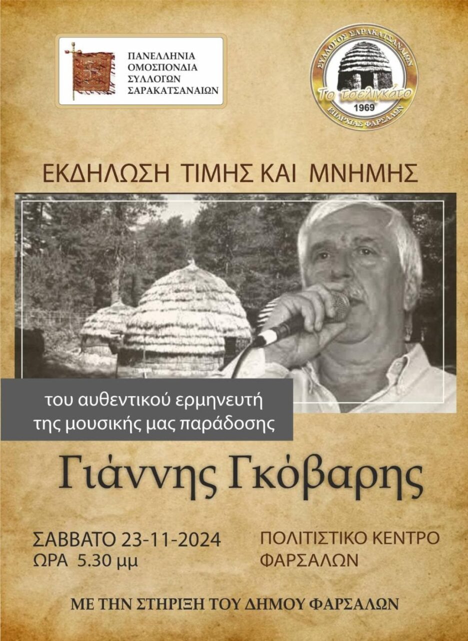 Η Π.Ο.Σ.Σ. σε συνεργασία με τον Σύλλογο Σαρακατσαναίων Επαρχίας Φαρσάλων, διοργανώνουν εκδήλωση προς τιμή του αείμνηστου Σαρακατσιάνου τραγουδιστή Γιάννη Γκόβαρη