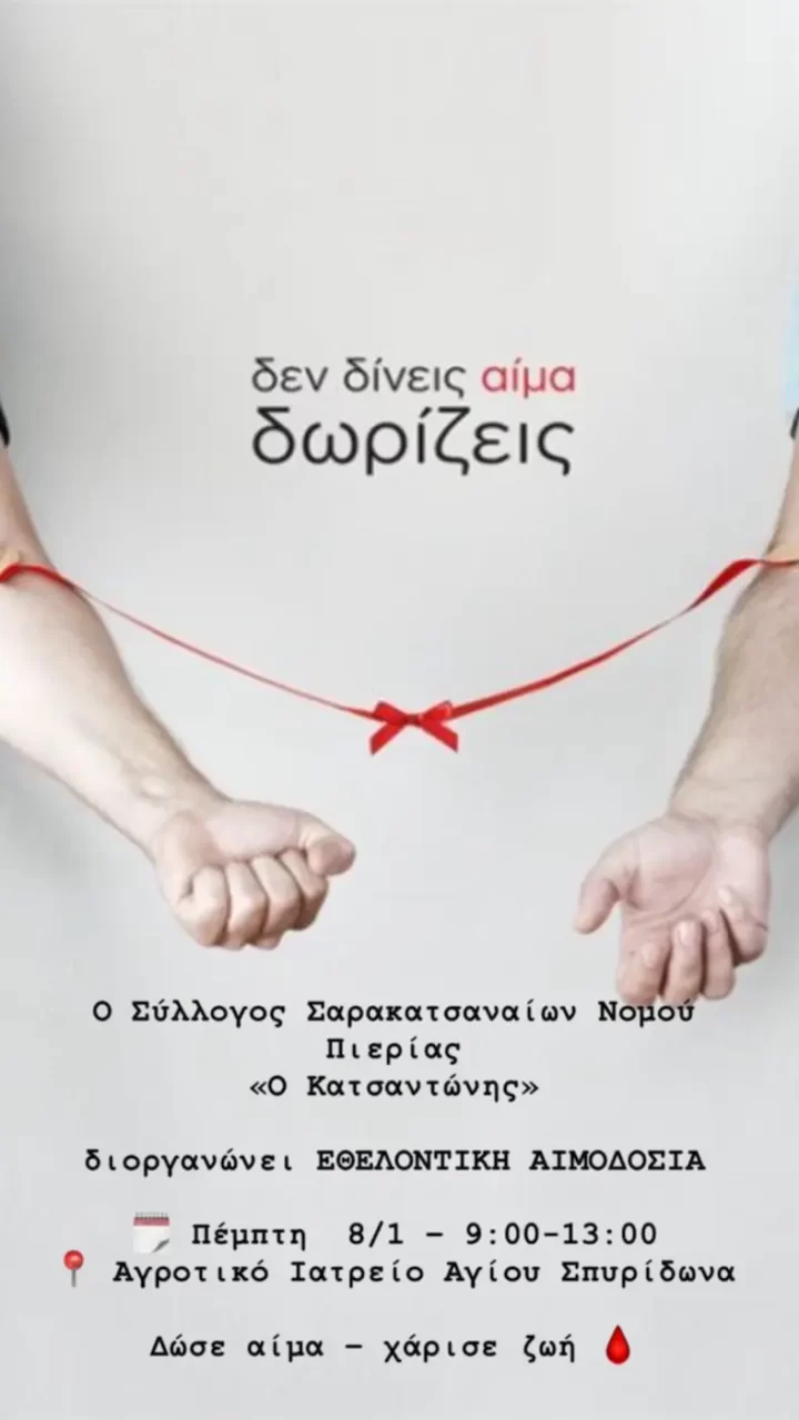 Εθελοντική Αιμοδοσία . Ο Σύλλογος Σαρακατσαναίων Νομού Πιερίας σας προσκαλεί να συμμετάσχετε στην εθελοντική αιμοδοσία που διοργανώνει την: 📅 Πέμπτη 8 Ιανουαρίου 📍 Αγροτικό Ιατρείο Αγίου Σπυρίδωνα ⏰ Ώρες: 09:00 […]