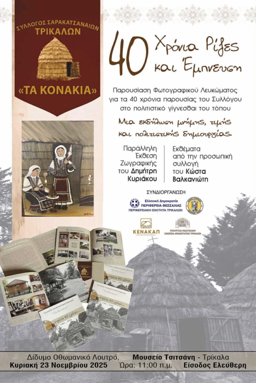 Ο Σύλλογος Σαρακατσαναίων Τρικάλων «ΤΑ ΚΟΝΑΚΙΑ» τιμά την 40ετή και πλέον πορεία του με μια επίσημη εκδήλωση μνήμης και πολιτιστικής κληρονομιάς: Κυριακή 23 Νοεμβρίου 2025 11:00 π.μ. Δίδυμο Οθωμανικό Λουτρό […]