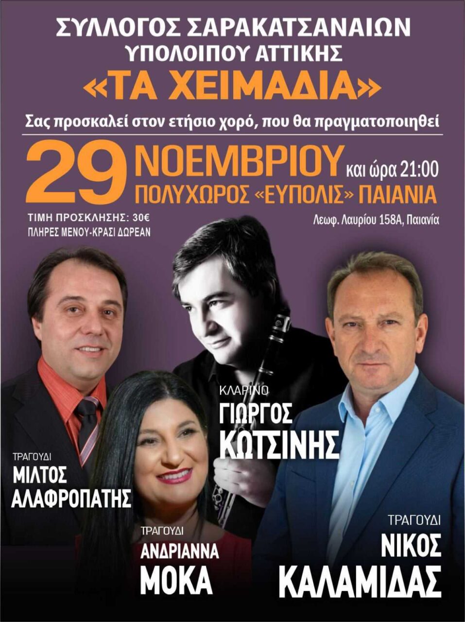 Σας προσκαλούμε και εμείς στον ετήσιο χορό του Συλλόγου Σαρακατσαναίων Υπολοίπου Αττικής «Τα Χειμάδια», που θα πραγματοποιηθεί το Σάββατο 29 Νοεμβρίου 2025 και ώρα 21:00, στον πολυχώρο «ΕΥΠΟΛΙΣ» στην Παιανία […]
